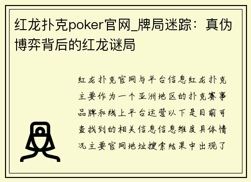 关于您“红龙扑克是不是机器人”的疑问,首先需要澄清一个关键点:红龙扑克本身不是一个机器人,也不是一个由机器人主导的游戏,而是一个专业的扑克新闻媒体报道平台。它致力于分析和报道扑克行业的各种动态,其中就...